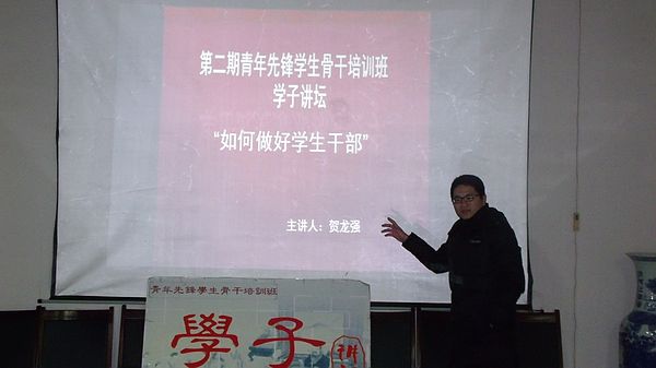 为充分发挥青年先锋学生骨干模范带头作用、方便广大同学学习借鉴其成功经验,12月15日晚,第二期青年先锋学生骨干培训班之学子讲坛在13号教学楼五楼会议室举办,我院学生会主席贺龙强担任主讲。