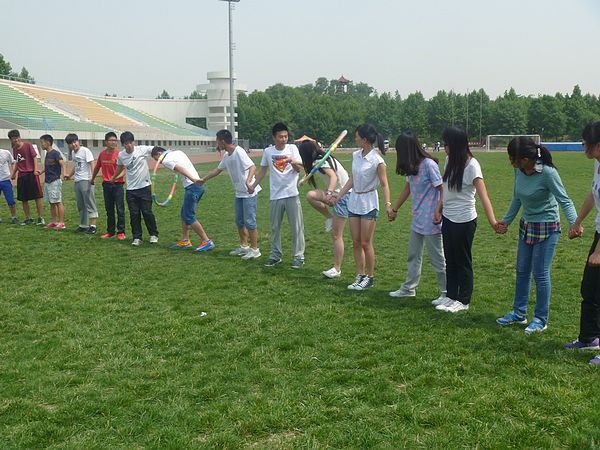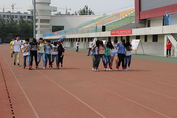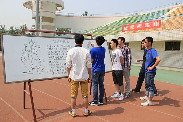 “袋鼠画眼睛”为小组参赛,每队六人,分为两个小组,每小组的三人中有一人负责从起点开始手拿一支笔袋鼠跳50米,到达终点将笔传给自己的一名队友,拿到笔的同学要蒙上眼睛,原地转三圈,在剩下的一位队友的指引下,走到题板前,在指定位置画下一只眼睛。这一组进行完之后,示意另一组同学开始,将另一只眼睛画好。各队的所用时间最短组获胜。此项目需要队员之间互相信任,指挥准确,有利于锻炼队员们的团队协作能力。