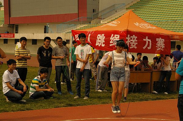 “四人跳绳接力”运动每支队伍由男生女生各两名组成,队员们围站一圈。比赛中同组四人接力跳绳,每人跳50个,记录四人都跳完的所用时间,即该组成绩。比赛时各队员为了团队的荣誉拼尽全力,有的跳跳停停,有的却玩起“双摇”。现场人声鼎沸,气氛热烈。每支队伍中都不乏技术高超的队员为小组争取时间,并博得观众的激情喝彩。