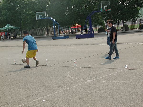 “三项全能”比赛分为定点投篮、障碍跑和定点射门三个子活动,是一项综合性较强的趣味运功。活动中,每位选手为缩短比赛时间,获得最佳成绩各展其能,竭尽全力。定点投篮环节,选手们曲腿、压腕、指尖拨球,动作标准,有的选手显然是练家子,一投命中,展示了不俗的实力,为他们的比赛赢得了时间。之后的障碍跑环节,选手则更是争分夺秒,带着足球轻巧的逾越障碍,在绕过五个“桩”后,一脚猛射,将球踢进了球门,完成比赛。选手们竭尽全力投入到比赛当中,赢得在场观众的阵阵掌声。