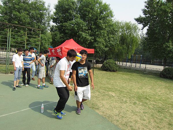 “双龙戏珠”旨在发展人体侧向或背向移动的灵活性,培养合作意识和团队精神。开赛前,各队选手分别面对面的侧向站立于各自赛道的起点线后,并分别将排球顶夹对挤于彼此的前额之间,顶夹稳妥后,双臂放于体后互挽。令发后,以球为媒并连为一体的两位选手应采用相应的走、跑动作同步向前侧行,绕过前方设置的障碍物后可以将“珠”取下重新调整后返回,直至抵达终点。终止计时以两人顶夹对挤之球的前沿触及终点线内沿出直面时为准,用时少的队伍获胜。赛场上他们巧妙配合,精诚合作成为赛场上一道亮丽的风景线。