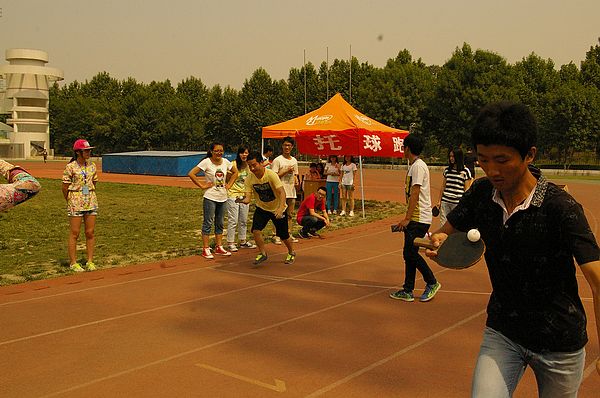 “托球跑”是展示速度、技巧与协作的项目。参加托球跑的选手用手中的乒乓球拍拖着轻巧的小球,并跑过三十米的距离把球交接给下一位队友。四名同学用时最短组获胜。比赛过程中,有的同学采取了速战速决的策略,一开跑就加足马力,借着惯性把球送到终点。有的同学则是尽量减少风险,小心翼翼地托着球,一步一步,稳稳当当地向终点走去。赛场上笑声连连,精彩不断。