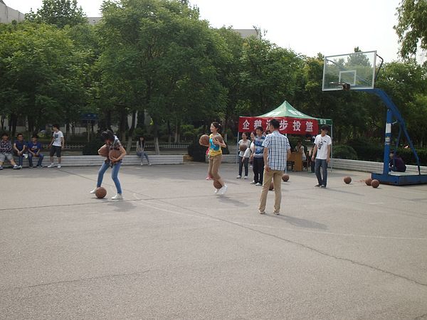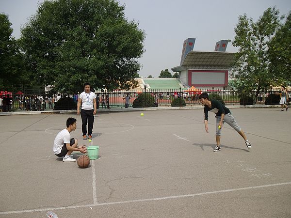 “娱乐篮球3+2”一直是趣味运动会中最精彩的看点。各学院分别派出代表队参与此项赛事的角逐。比赛要求,每队出三男两女,男生负责抢篮板球、可以运球,但得分全部由女生完成。进攻时,男生不得进入三秒区否则视为违例,女生不得出三秒区(这样在女生防守时也可以更好的保护女生)。球场上球员积极拼抢,男生们熟练的运球、传球,尽显自己的过硬的本领,女生们积极投球、拦球,亦风采独具。场上如火如荼,场下欢呼阵阵,虽然天气很热,但丝毫不减大家对比赛的热情。