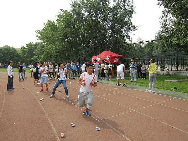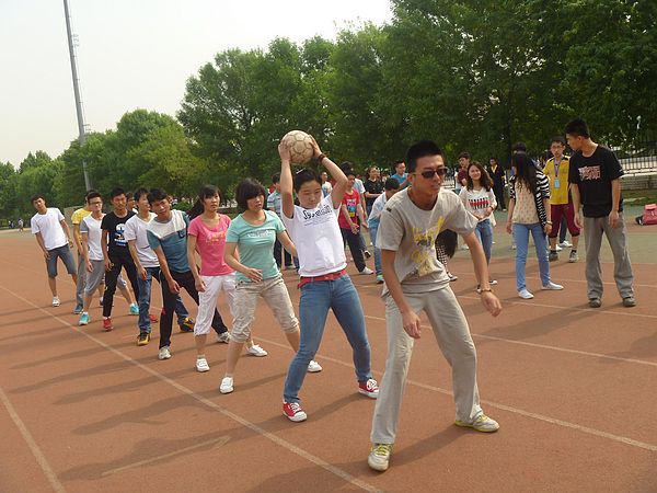 “海底捞月”是一项考验团队合作能力的运动项目。参赛队伍要求每队十人,第一名队员胸前抱住篮球,其余队员弯下腰,双脚分开,当听到裁判发令后,第一名队员将球从胯下传给第二名队员,第二名队员将球从头部传给第三名队员,依此类推,最后一名同学拿到球以后跑到队伍最前面继续传球,循环此规则,直至每一位队员都当过排头后结束比赛,用时少组获胜。来自各个学院的队伍纷纷报名参加此项运动,比赛过程精彩纷呈,呐喊加油声络绎不绝,点燃了赛场激烈的气氛。