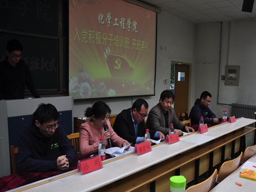 为贯彻落实党内政策,积极开展我院党政工作,提高我院入党积极分子的党性认识, 4月19日,我院在4号教学楼106教室举行“化学工程学院入党积极分子培训班”开班仪式。我院党总支副书记董云会、党总支副书记李冰强、团总支书记廖君华、辅导员孙明、郭洪涛及学院全部入党积极分子参加了此次仪式。开班仪式由廖君华主持召开。