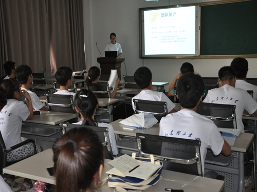 在对社会实践进行一番简要介绍后,亓鹏重点强调了社会实践的意义,并鼓励全体成员做更实际、更有特色的实践活动。接下来是团队展示环节,各负责人轮流上台,利用PPT对本团队社会实践主题及流程安排进行讲解。环境调研、地区支教、关爱留守儿童、安全知识普及……九个团队主题各不相同,但都是团队成员们对实践活动的精心准备与筹划,同时体现了他们多种多样的创意。每一次讲解完毕,老师们都会结合团队的实际展示情况,从可行性、活动效率及特色创新等几个方面对实践方案进行多角度的点评和指导。针对学生对有关问题的回答,各位老师相应提出自己的建议。过程中不时出现老师与学生激烈讨论的场面,整个教室的气氛因为这些讨论而活跃起来。会后,老师们与全体社会实践团队成员合影。