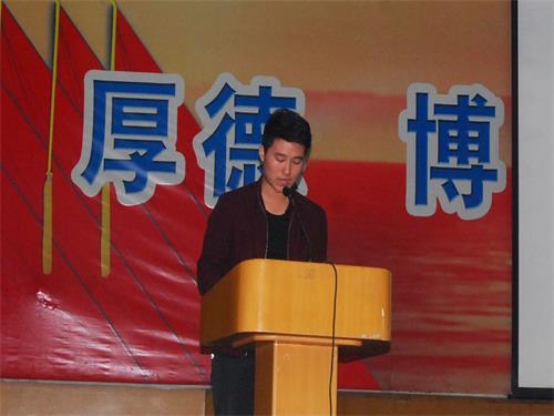 最后,由新生代表、化工1504班褚庆磊发言。他先分享了进入大学的感受,“虽远离家乡,但并不孤单”他说。也希望所有新同学们能够适应接下来的真正的大学生活,调整好心态去迎接新的挑战。
