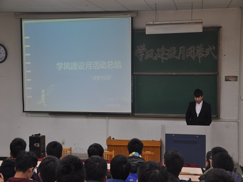 接下来,由学习部代表向老师及同学们进行学风建设成果展示,成果展示主要分为各班学风建设ppt展示情况,查课情况,微博转发情况,工作总结及未来展望。他说,在学风建设活动中,每个班级都积极参与其中,并取得优异成绩。学风建设活动虽然结束,但是,学风建设将继续进行下去,为学院打造良好学习氛围,促进同学们树立目标,实现梦想。他还根据各班各项得分,得出各班年级排名,并由三位老师上台为各年级前三名优秀班级颁奖。随后,大一、大二优秀班级代表向同学们进行学风建设月活动及成果的展示。各类特色活动吸引了同学们的眼球,得到老师们的赞扬。