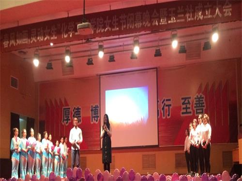 大会伊始,亓鹏代表我院老师发表简单演讲,她提到:希望玉兰社成立以后,能够将我院女同学变成“上得了厅堂,下得了厨房”的女神。随后文艺表演正式开始,刚一上场的2015级男生们就用绚丽的荧光棒吸引了台下观众的目光,接下来优雅的歌曲和诙谐的小品、相声也赢得大家热烈的掌声。16届主席团成员的出现更是把现场的气氛带向一个小高潮,他们先用歌声震撼观众,后用搞笑的舞蹈赢得观众的笑声。舞台上的灯光重新点亮,玉兰社其中一部分干事身着浅蓝色舞衣,手捧鲜花,翩然起舞,一支《雨中花》将现场热烈的气氛安抚下来,曲子结束,姑娘们退列两旁,时尚又靓酷的其他干事登场,一支现代舞《cry cry》重新将现场的气氛点燃,节目结束后,玉兰社部长王丹琦上台,向大家做社团简介,她说到:玉兰社是个新社团,将采用新颖的“每月一主题”方式举办活动,争取从各个方面入手,将我院的女生培养成秀外慧中、落落大方的女神。最后,在化教1501班的歌声中,此次活动落下帷幕。