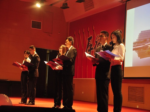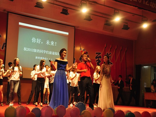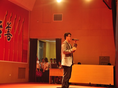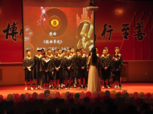 远征路非期期艾艾,成梦想绝不踽踽独行。在第二次抽奖活动后,话剧《大话西游》引爆全场,别样的剧本引起同学们的兴趣,目不转睛,拍手叫好。诗朗诵《我们一起走过的青春》叙述了大学四年的点点滴滴、欢声笑语、共度困难,引得同学们回忆良久,约定以后再聚。不知不觉中,晚会即将结束,2012级辅导员郭洪涛走上舞台,他说:“转眼间,同学们已经毕业,眼前还是一幕幕刚入学的样子。”情深意切,恋恋不舍。最后,一首《小苹果》表达了他对毕业生们的祝福与期望,同学们全程用手掌打节拍来和郭老师的歌曲,晚会再一次进入高潮。