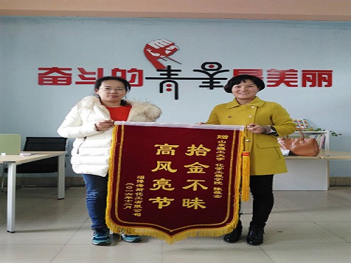 12月10日上午,化工1604班学生陈薇全结束了位于第二体育场的最后一节体育课,收拾书包准备返回寝室时,她在篮球架旁赫然看到一褐色钱包。打开钱包后,陈薇全发现里面大约有几千元现金,更重要的是钱包内装着身份证、银行卡和数张其他卡片,甚至还包括一张十万元的银行汇款证明。“钱包里的东西看起来很重要,失主一定很着急。”陈薇全第一反应是通过老师的帮助尽快联系失主,不能让失主太着急。想到这里,她马上联系了在鸿远楼工作的学院辅导员亓鹏,接到消息后,亓老师火速将失物招领启事发布出去,试图联系失主。不久,山东增岳化工贸易有限公司销售经理、失主朱国永看到招领启事,与亓鹏取得联系。在确定为自己的钱包后,朱国永万分激动地说:“发现钱包丢失之后我很着急,里面不少卡片都是很难重新再办的。之前已经报过警,但根本没有什么音讯,我觉得找回来的几率已经不大了。钱包能够失而复得我真是很感激!”他对陈薇全竖起大拇指,“十分佩服陈同学拾金不昧的好品德,这也归功于咱们学院对学生的良好教育啊!”领回钱包后,失主执意要把钱包内的几千元现金赠予陈薇全表达感谢,最终被陈薇全婉拒了。“这是我们当代大学生该具有的素质,我相信换做别人肯定也会这么做的。”接受采访时她略带腼腆地对我们说。事后,朱国永特意订做了 “高风亮节 拾金不昧”锦旗送给陈薇全,以表达对她的感激和赞扬。