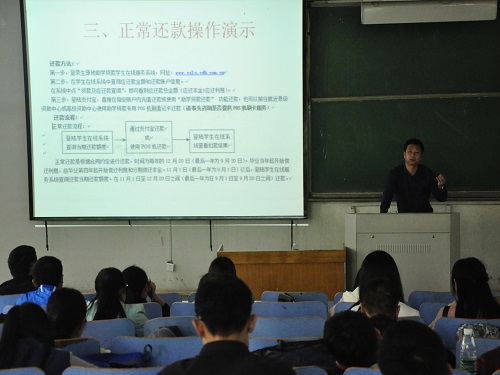 与会人员有序签到后,每人分发一张介绍单页,初步了解助学贷款的相关事宜以及还款事项。随后,张生元以PPT的形式,形象直观、条理清晰地向同学们展示登录国家开发银行学生在线服务系统的具体流程,提交毕业确认申请的相关步骤,在忘记密码的情况下找回密码的对应方法以及正常还款、提前还款的各项流程及方法。并提示同学们要及时进行个人信息变更,避免出现因贷款逾期造成的个人信用损失问题。讲解人还详细地列举出操作过程中可能出现的问题以及解决方法,确保同学们操作过程中的准确无误。