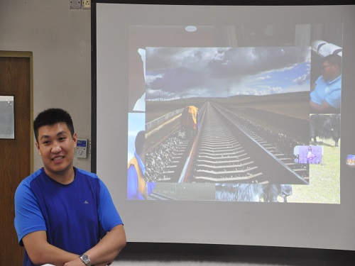 交流会伊始,主持人致开场白简单介绍三位主讲人,并通过视频向大家简单展示三位主人公的“正能量”事例,紧接着,三位主讲人分别以PPT的形式具体讲述他们的故事。首先,张家铭为我们讲述“生命禁区”的故事,在这个超过4500米的高原地区,“天路格桑”实践团像盛开的格桑花一样平凡又美丽。起初因环境恶劣导致的高原反应、肺水肿等种种身体不适都一点一滴地击打着这个团队的信心与决心,但他们并没有选择放弃,而是选择坚持下来,探寻这条天路上辛劳工作者的故事,从铁路工人身上他们感受到“祖国需要我”的无私奉献精神,我们从他们身上感受到肯吃苦的精神与坚持的毅力。