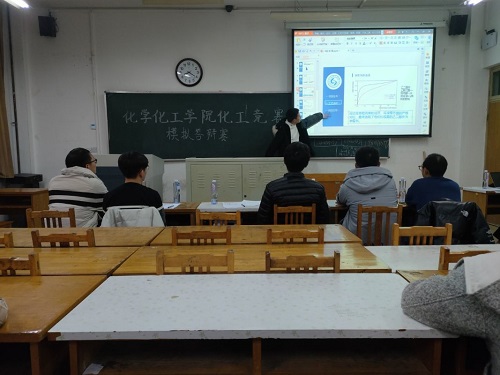 为培养学生对化工竞赛的兴趣,增强学生化工竞赛能力,化学化工学院化工设计联盟于12月9日在13号教学楼405教室举办化工竞赛模拟答辩赛。化工设计联盟副会长温金龙、张明霞,部分干事参加此次活动。 活动开始前,温金龙组织干事布置比赛现场,随后,参赛人员在干事的引导下有序签到入场。此次答辩赛,化工设计联盟邀请到化工竞赛学习小组副组长叶鑫宇、王健、周国正、徐永上、王涛、朱永凯学长担任答辩赛评委。答辩赛的规则是选手答辩五分钟,评委提问三分钟。答辩赛由李超月担任主持人,首先李超月上台介绍答辩规则和答辩评委,后宣布答辩赛正式开始。八个答辩小组依次 上台展示答辩作品,然后由评委老师依次提问,指正,并给出相关建议。 在八个小组都完成答辩后,周国正总结此次模拟答辩赛出现的问题,他讲到,答辩同学应该时刻注意自己的仪表形象,以求给评委好印象,同时,ppt不应做得太复杂,应该尽量简单并突出重点。最后,李超月宣布答辩赛结束,大家一起拍照留念。 此次模拟答辩赛共有八组参赛,同学们积极参赛不仅体验化工竞赛的氛围,更激发同学参加化工竞赛的兴趣,培养同学化工竞赛能力,积累一定的比赛经验,为参加化工竞赛奠定一定的知识基础。
