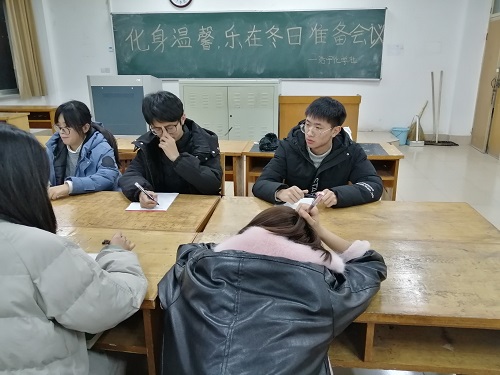 为了在这个寒冷的冬天让同学们感受到浩宇化学社的温暖,浩宇化学准备举办“化身温馨,乐在冬日”活动。浩宇化学社全体干事共同准备活动的前期工作。12月15日下午浩宇化学社在13号教学楼407教室举行此次活动的准备会议。浩宇化学社副会长朱志晓和刘晓以及全体干事参加此次会议。 此次会议由干事张家乐主持,会议伊始,张家乐向大家介绍了此次活动的活动流程,并提出此次活动中的一些问题。随后大家讨论问题的解决方法,并最终确定解决困难的解决方案。接下来,张家乐结合大家对于社团具体工作的熟悉程度分配活动前的任务。在会议过程中,大家共同商量然后确定活动中的趣味实验。干事们现场操作实验,以观察实验现象及效果。 实验操作完成之后,大家对于活动现场发生的一些问题进行讨论。讨论完成之后,朱志晓和刘晓分别对干事们的活动准备工作提出建议,干事们认真听取建议,并积极完善活动准备工作。当天晚上,浩宇化学社全体干事在五号教学楼晚自习教室进行此次活动线下宣传。干事们两个人为一组,分别前往不同的自习室宣传。宣传过程中,干事们分工明确,一位干事为大家讲解此次活动目的,活动流程,并且鼓舞大家积极参加此次活动。另一位干事,向大家分发此次活动的宣传单页,并且在黑板上写下活动交流群群号,方便大家有问题可以随时在群里交流。 在活动的准备工作中,浩宇化学社全体干事齐心协力,全力做好每一项任务,努力使活动能够顺利进行。