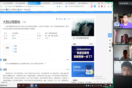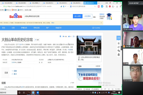 线上实践过程中,由实践团队长王曼在百度网页搜索大别山革命历史纪念馆,团队成员通过共享屏幕一同观看纪念馆,感受它的历史,并发表感悟。紧接着,由队长王曼向大家介绍大别山的革命,包括“挺进大别山”等具有重大历史意义的革命事件。
