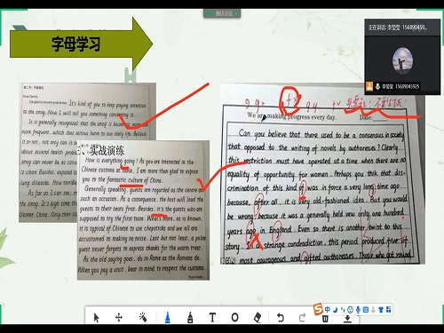 上午由队员李莹莹为线上同学进行英语课程教学。首先,李莹莹带领大家认识了一些初中必备英语单词,李莹莹先是给同学们领读每个单词,之后让他们自由练习,最后对这些单词进行读写检查。其次,李莹莹还向同学们介绍了听力技巧。她讲解到:听力之前要进入准备状态,先把问题和答案粗略的看一遍,大致了解这篇听力是讲的什么内容。听力时不要慌张,仔细去听一些关键词,往往答案就这里。在上午最后的自习时间里,李莹莹还带领大家一起欣赏了几篇优秀的作文,并传授写作文注意点。通过李莹莹上午的授课,孩子们不仅学习到了重要的知识点,而且对今后的英语学习更加自信,不再认为英语是一门很难学好的课程。英语语言的学习对孩子们今后非常重要,能让孩子们有这样的感受,团队成员都感到很欣慰。