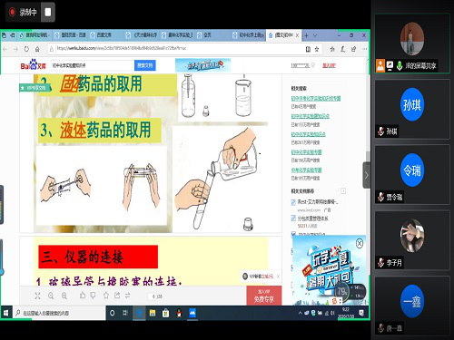 上午九点,同学们准时进入腾讯会议等待上课。本堂课的授课教师姚美美按照惯例,采用PPT的形式进行授课。课堂上,姚美美利用PPT的展示优势,通过一些诙谐幽默的图画与展示方式,生动形象地向同学们简单介绍了化学这一学科的基本概念,并通过一些趣味动画,介绍实验中常用仪器的使用方法。由于听课的学生们大多是初中生,从未真正接触过化学这门学科,对化学这一门新学科既感到害怕又感到好奇。一部分同学听到化学第一个联想到的就是爆炸,对化学存在部分误解。姚美美随后向同学们播放了几个简单有趣的家庭小实验的视频,并对其中的原理进行详细的讲解,寓教于意,旨在培养学生们对于化学的兴趣。在一下午的学习过程中,很多同学对化学产生了浓厚的兴趣,并表示以后的学习中会更加注重探索,并尝试动手实践。