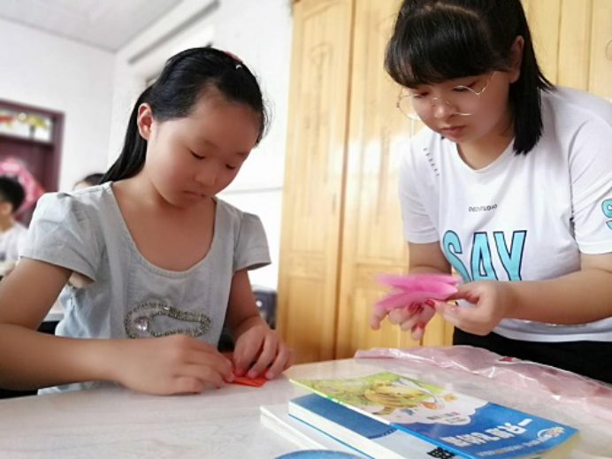 上午由团队队员刘忠洁为小朋友们进行折纸课程,在课程开始前刘忠洁综合孩子们意见及网上的折纸教程,选取了心形折纸、纸折千纸鹤等作为授课内容,在课程开始时,刘忠洁一边为小朋友们讲解折纸步骤,一边进行示范,并带领大家一同动手实践,小朋友们表现出极高的兴趣,在刘忠洁细致的讲解以及耐心的指导下,一个个心形折纸在小朋友们的手中成型,欣赏着自己的作品,小朋友们的脸上满是开心的笑容,课后还有不少小朋友围着老师学习折纸,对折纸充满了兴趣,还有一些学生在下课后将自己的折纸作品送给了老师,感谢老师每天辛苦授课。