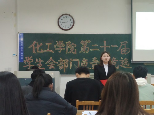 3月21日晚,化学化工学院学生会在13号教学楼405教室举行第二十一届学生会部门负责人竞选,学生会负责人助理参与此次竞选,学生会主席、部长及19、20级各班长团支书担任评委。