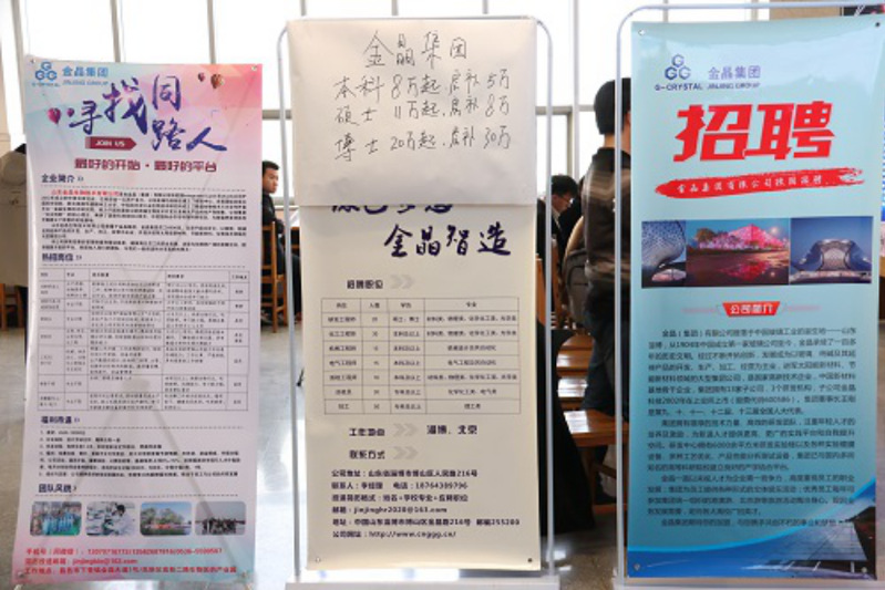 富海集团有限公司、山东金晶生物技术有限公司、山东博汇集团有限公司山东海成石化工程设计有限公司、青岛华丰伟业电力科技工程有限公司、烟台九目化学股份有限公司、东岳集团、金晶集团有限公司等公司前来参会,为大四学生提供了多种就业岗位和职业选择 。
