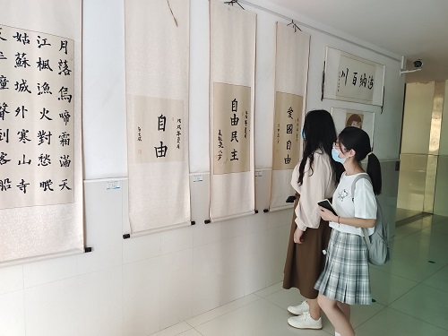 7月8日,“问渠”暑期社会实践团队走进周村区碧桂园小学进行调研,参观在课后延时服务中学生们完成的书画作品展览。