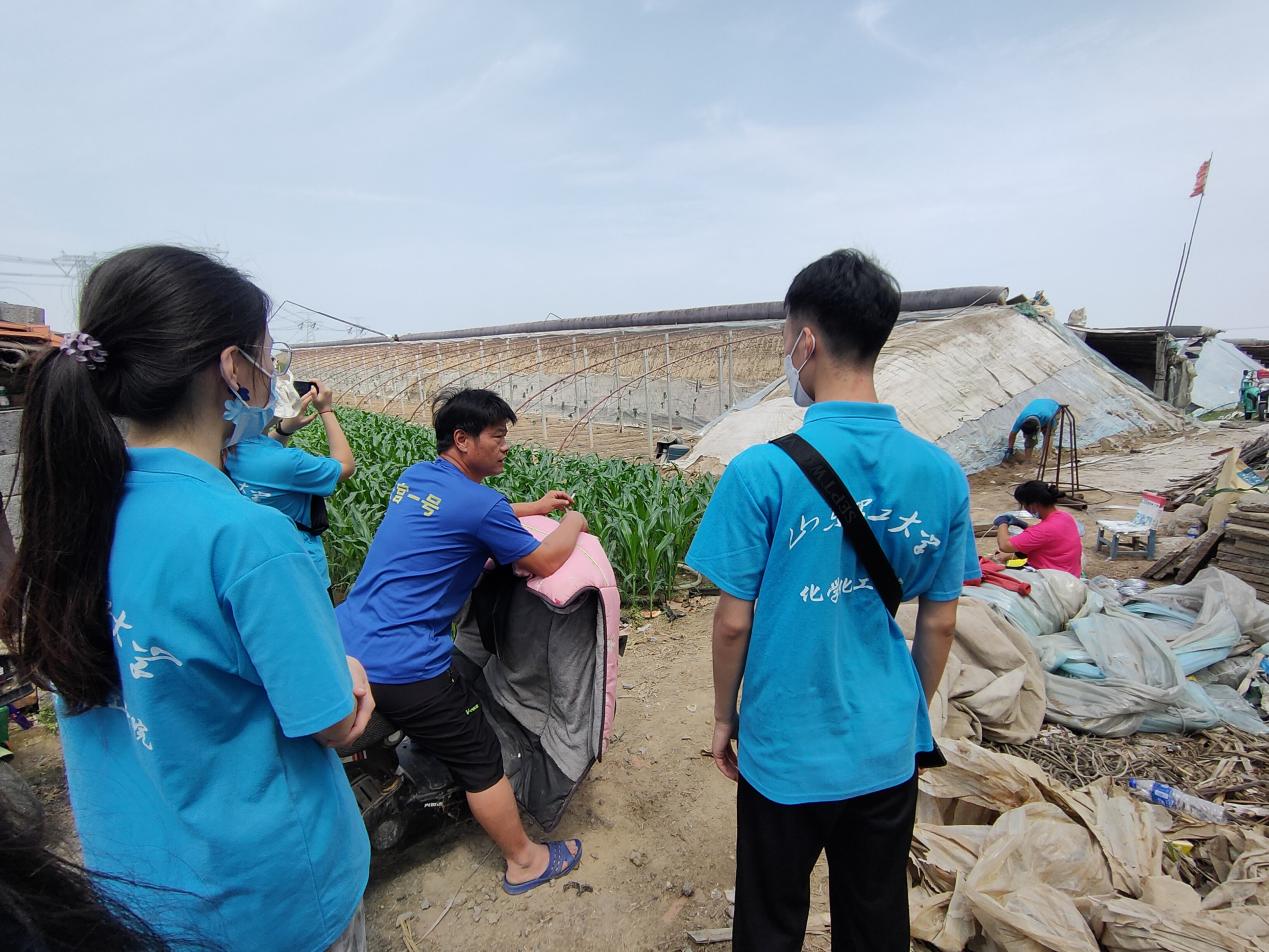 (图为实践团成员向当地农户询问有关大棚种植的产量和销路)