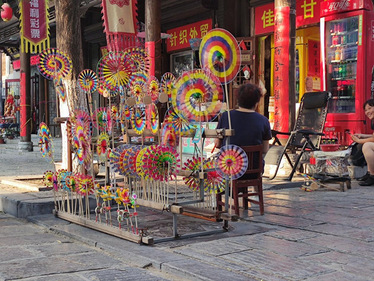 实践团对青州古城内的店铺进行交流与访谈,分析古城内的产业结构与发展情况,团队发现其中手工艺店铺居多,除了街道两侧常见的风车铺子以外,在古城内随处可见种类多样的特色手工产品店,例如手工茶水壶、花枝剪刀、葫芦红木手把件等等。在排列鳞次节比的青石砖路的街道上,有的更多的是非遗传承与当代手工产品的有机结合,古城人在文旅产业创作中添加对于小康社会的美好憧憬和对如今生活的真实理解,富有创意并人情味十足。