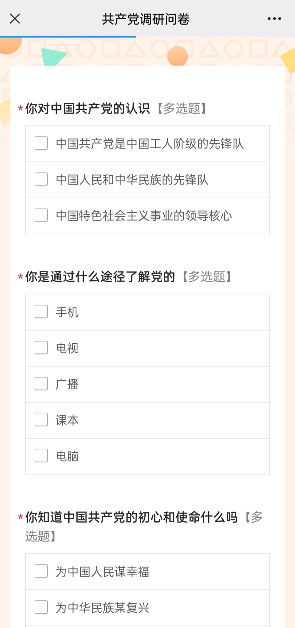 首先,由实践团新闻组负责关于入队、入团、入党的调查问卷的制作,新闻组成员从对少先队,共青团和共产党是否了解出发,结合入队、入团、入党的动机以及如何成为一名优秀的少先队员、共青团员和共产党员制作调查问卷。在调查问卷制作完成后,实践团成员分别通过线上和线下结合的方式向不同人群发放调查问卷。截至目前,问卷调查工作已告一段落并取得圆满成功。