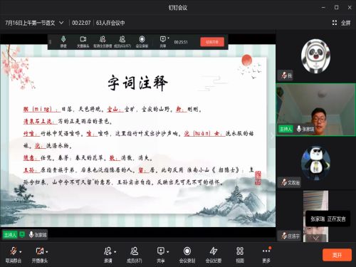 “叮铃铃”上课铃响,张家瑞老师带领同学们朗读了本节课所要学习的古诗《山居秋暝》,随着朗朗读书声,同学们的心也从曲折历史故事中逐渐平静下来。老师对于诗人王维的独特见解,引发了孩子们的思考与讨论。一时间,课堂中的观点百花齐放,许多同学甚至找出了自己的诗词书,跟着老师的讲解一起翻阅起来。“明月松间照,清泉石上流。”这句千古名句格外引发了孩子们的兴趣。老师让同学们闭上眼睛,“空山雨后的秋凉,松间明月的光照,石上清泉的声音以及浣女归来竹林中的喧笑声,渔船穿过荷花的动态,和谐完美地融合在一起……”用心体会着诗词的意境。同学们仿佛身处深山,独自在秋雨后与大自然进行了一场心灵的沟通。孩子们已然与诗人产生了灵魂上的共鸣,久久不能平息。