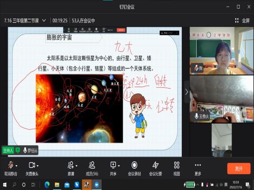 科学课结束后,罗任远老师播放了科普短视频“宇宙到底有多大”,同学们的视角也穿越到了灿烂的宇宙星河中。罗任远老师绘声绘色的讲解,顿时引燃了同学们探索宇宙的好奇心。同学们在看到太阳系八大行星后纷纷自愿举手讲出了八大行星的名字。此时同学们已对太阳系有了一定程度了解,课程也从浩瀚缥缈的宇宙,慢慢聚焦于一颗蔚蓝色的星球——地球。罗任远向同学们提出了两个问题:“地球为什么会有白天和黑夜交替?”、“我们需要多大的速度才可以飞出地球?”。同学们纷纷举手发表自己的看法,在听完孩子们天马行空般的想象后,罗老师并没有直接告诉同学们答案,而是以月亮为切入点,通过课件动画,慢慢引导同学们发现问题的正确答案。接着罗老师讲述了航空航天器的主要构造和航空航天器的发射过程,并让孩子们了解我国当前航空航天技术的发展情况,增强了同学们对祖国的认同感和自豪感,进一步激发了同学们探索宇宙的兴趣和热情,与此同时也激励了同学们努力学习、勤奋工作为我国未来的航空航天事业做贡献。