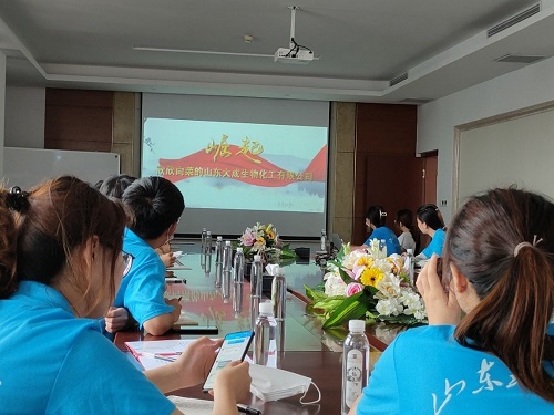 (图为团队成员观看山东大成生物化工有限公司“前世今生”视频)