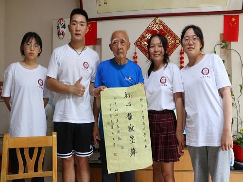 来到老党员张元成家里,处于耄耋之年的张元成虽然头发、眉毛雪白,但身板硬朗,精神矍铄。他热情地欢迎实践团成员的到来,张元成做了精心的准备,并给实践团成员准备了书法作品礼物,书法中展现出张元成对新一代学子的殷切希望。他向实践团成员展示自己写的书法作品,隽秀大气的毛笔字体现出一位为人师者的严谨与认真。张元成携长辈的殷切期望,深深激励着新一代学子鸿鹄之志。
