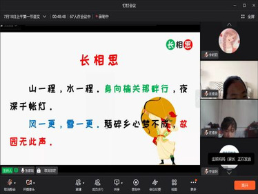 “山一程,水一程,身向榆关那畔行,夜深千帐灯。”伴随着同学们整齐而洪亮的朗读声,语文课拉开了帷幕。为提高各同学的审美能力,提升母语文化素养,培养文化内涵,坚定文化自信,张家瑞老师带领各同学穿越时代,一起鉴赏清代词人纳兰性德的词作《长相思》。老师通过对文章的翻译与讲解,进一步的传达诗人的对故乡无限的热爱与留恋,在完成对《长相思》的学习后,学生们深深地被纳兰性德的爱国之情,思乡之心而感动,通过联系生活后,每位学生都有了自己的观点和感悟,积极连麦互动,声情并茂地朗读《长相思》。对《长相思》的教学,培养了学生的家国情怀,使学生心中有家,心里有国。