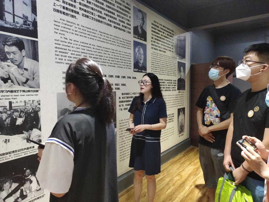 在苏老师的讲解下,团队成员了解到鲁派最有特色的是能够利用瓷器上用的釉彩在鼻烟盒的内壁上作画,然后烘烧形成内画鼻烟壶的瓷釉画,即使盛水画面也毫不受损。在参观过程中,团队成员感慨万分,惊叹于小小鼻烟壶里的乾坤世界,以及以琉璃瓶为载体带来的视觉冲击力。