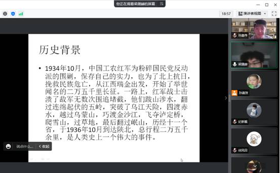 教学伊始,由实践团成员梁晟赫为小朋友们讲解毛主席所著诗歌《七律·长征》。梁晟赫成员从诗歌的历史背景、诗歌情感、遣词造句等方面,对《七律·长征》进行了逐句分析,讲解生动且清晰,小朋友们目不转睛地看着屏幕上演示文稿上的文字版讲解,全神贯注地听讲。