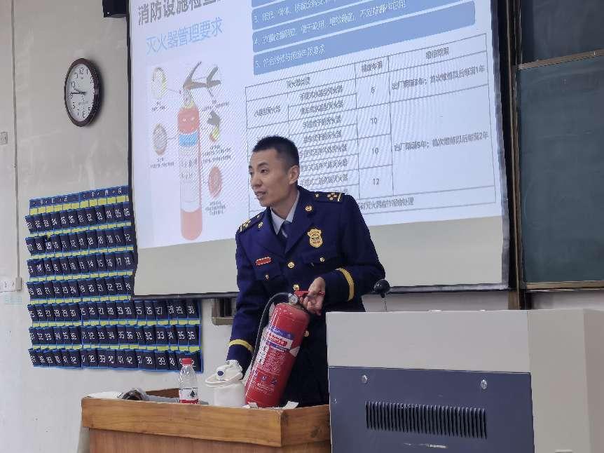 活动主要分为三个环节:首先是消防安全教育培训。培训伊始,王介忠书记强调,广大师生要高度重视消防安全,珍惜此次消防安全演练活动,提高消防安全意识,在思想和行动上充分认识消防安全的重要性和必要性。随后,张健利用专业消防知识及技能,结合真实案例,向大家讲述火灾特点、火灾发生的严重后果及疏散和逃生知识,为参加讲座的师生敲响了消防安全的警钟。同时,张健还对灭火器械、防烟面具的正确使用方法和注意事项进行了详细讲解。