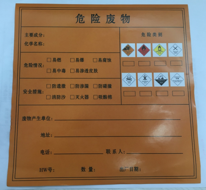(1)标签上所有信息都需要填写,电话联系人填写教师信息,HW号统一为49,数量填写质量或者体积,空瓶填写个数。(注意:空瓶的危废标签也需要全部填全)