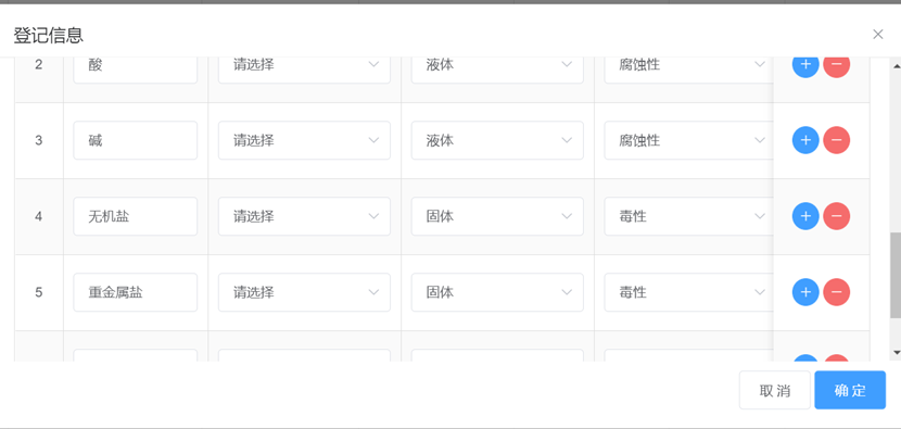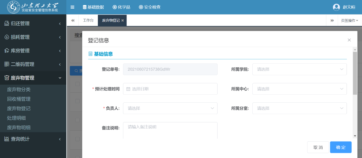 各组负责人登录系统,填写废弃物登记申请。可以分大类填写,如无机盐、废酸、废碱、有机物等等。