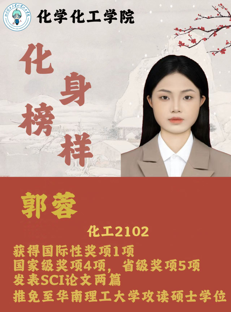 个人简历:中共预备党员,前六学期智育成绩位于专业第四,综测位于专业第三,连续三年获得校级一等奖学金,获得2023-2024年国家奖学金、正华英语先进个人奖学金、齐氟大学生科创竞赛先进个人奖学金等7项奖学金,获校级优秀学生等荣誉称号4项。作为核心成员参与一项校级大创项目并获优秀结项,累计获得国际性奖项1项,国家级奖项4项,省级奖项5项,发表SCI论文两篇,2024年赴拉脱维亚里加工业大学短期交流。现已被推免至华南理工大学攻读硕士学位。