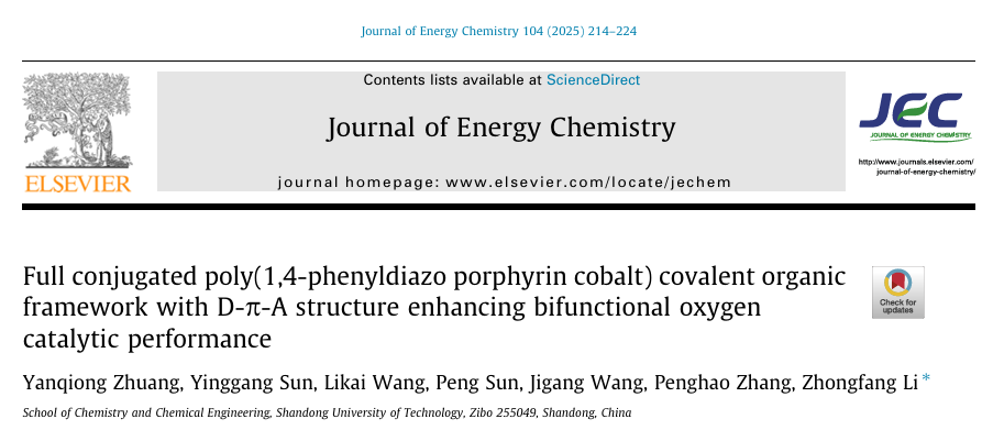 近日,我院燃料电池团队李忠芳教授在全共轭金属卟啉基双功能氧催化剂领域取得重要进展,相关成果以“Full conjugated poly(1,4-phenyldiazo porphyrin cobalt) covalent organic framework with D-p-A structure enhancing bifunctional oxygen catalytic performance”为题发表在化工一区TOP期刊Journal of Energy Chemistry上。(J. Energy Chem. 2025.104: 214-224.)
