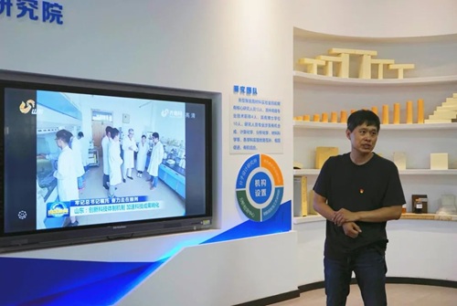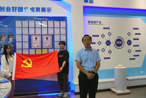 以专业报国践行初心使命,选择在党的生日举行宣誓仪式,是学院党委深化党员教育的重要举措。在科技成果展厅内,新发展党员们首先参观学习了学院在聚氨酯材料领域取得的重大科研成果。聚氨酯研究院毕戈华老师在介绍展厅内展示的成果说到“这些打破国外技术垄断的专利成果,正是化院人科技报国精神的生动体现。”