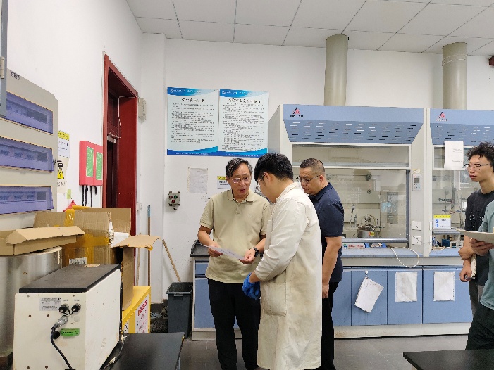 为保障秋季学期开学后教学、科研工作平稳有序开展,根据学校《关于做好2025年秋季学期开学实验室安全检查的通知》的相关要求,8月29日和30日,化工学院党委书记王介忠、院长杨乃涛、副院长刘会带领实验中心教师和研究生代表,对学院所有实验室开展了全面的、拉网式的安全隐患排查工作。此次检查旨在进一步加强实验室安全管理,防范化解安全风险,保障师生生命财产安全和校园稳定。