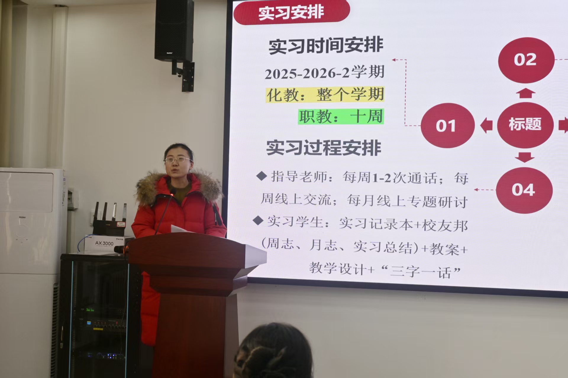 大会伊始,现场播放往年教育实习纪实短片,通过回顾往届学子的实习历程与成长收获,为参会学生提供可借鉴的实践范本与精神激励,引导大家坚定教育初心,做好实习的心理与行动双重准备。随后,马美宣读《化学化工学院2026年教育实习安排》,对实习时间规划、具体要求及注意事项作出明确说明,让学生们对实习工作有清晰认知。化教2201班曲英瑜结合自身实习经历作经验分享,以“探索、挑战、热爱”为核心,鼓励同学们在实习期间勇于探索实践、敢于迎接挑战,在实操中积累经验、提升专业能力。