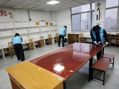 学院组织志愿者对教学楼5楼大厅开展专项清洁,全面清扫地面、擦拭墙面窗台、整理公共设施、清除卫生死角,以实际行动美化校园环境,引导师生共同守护文明家园。