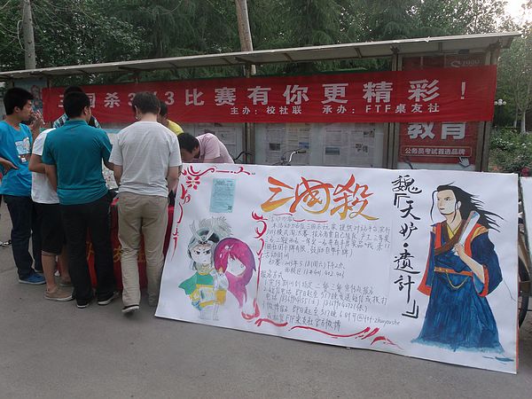 为进一步丰富大学生活,号召同学远离网游。5月14日下午,由校社联主办,我院FTF桌友社承办的“三国杀3V3比赛”前期宣传活动在第二餐厅门口开展。