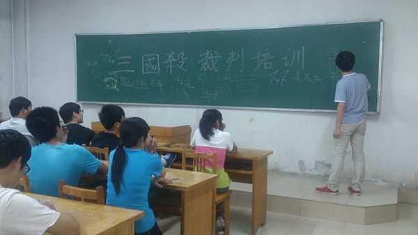 活动伊始,朱晓晨介绍此次比赛的赛制、出牌顺序及比赛进行中相关规则。他以详细的板书为辅,在讲台上对比赛裁判工作进行细致讲解,使参加培训者对此有了初步的认识。随后,活动的工作人员针对此次比赛中可能出现的种种问题与朱晓晨展开交流。提到比赛具体细节时,工作人员提出,个别参赛者也许会在比赛进行中主动暴露自己。对此朱晓晨说,针对违反相关规则的参赛者,第一次给予口头劝说,第二次则被要求退赛。朱晓晨耐心的为工作人员讲解各种违规、作弊行为,同时也告诫大家认真履行作为一名裁判的职责,保障比赛进行的通畅。最后,为使工作人员对裁判工作有切身真实的体会,朱晓晨带领大家体验了一把三国杀,在实践中消化所讲解的知识。培训在轻松愉快的氛围中结束。