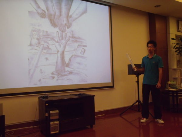 大赛伊始,由主持人介绍到场嘉宾、评委,并宣读比赛规则及评分细则。随后,伴随着柔和淡雅的轻音乐,决赛选手一一上台展示自己的作品,每位选手有2分钟的时间进行展示,通过简单扼要的语言向评委们阐述作品的立意、内涵。评委根据作品的画工、立意及色彩搭配为选手打分。决赛作品可谓风格各异,难分伯仲。选手个个表现不凡,作品有的以关爱孤儿、亲情友情为主题,有的则反映社会腐败现象,以反腐倡廉为立意;还有的则从自身出发,将大学生活真实深刻的反映出来。在众多作品当中,为数不少的选手不约而同的把主题定为了雅安地震,他们切合雅安地震的社会背景,以自己的理解创作出风格迥异的作品,表现自己的一种社会责任感。其中,一幅以黑灰白为主色调的作品映入大家眼帘,作品中描绘了在废墟下伸出的一双手,废墟上面有多双手去拉,以雅安废墟为背景,视觉冲击感强,令在场评委和观众震撼。