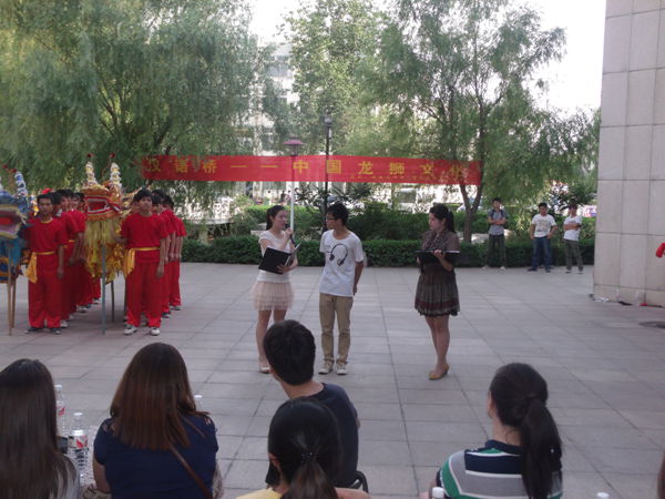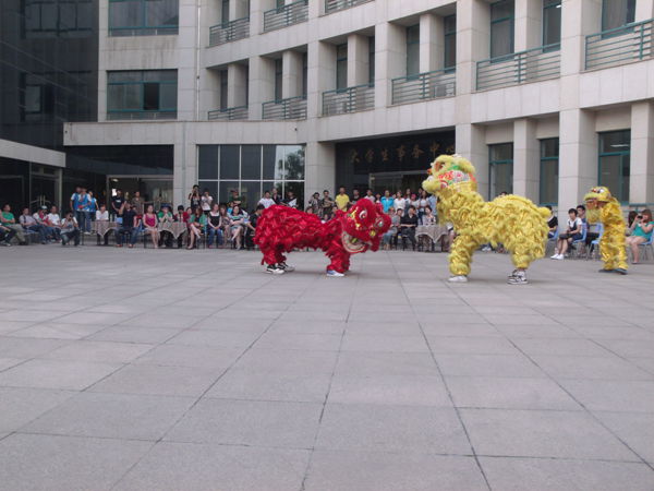 活动首先由主持人用英汉两种语言进行主持,对中国传统文化及民族精神做了简单的介绍后宣布了精彩的舞龙舞狮表演开始。现场随即鼓声四起,两条龙从广场两翼缓缓而出,“翻江倒海”、“环龙”等精彩的演出令在场观众大呼过瘾。“龙腾”之后,三只舞狮闪亮登场。翻滚、跳跃等高难度动作,惊险而又刺激的表演吊足了观众的胃口。随后,主持人将鼓乐社的社长邓加勇请上台来进行讲解龙狮文化。邓加勇从鼓乐社的建设、训练及发展前景上向大家做了详细的介绍。在随后的互动环节中,留学生代表切身体验了一把舞龙舞狮,青涩却又卖力的表演将现场气氛推向高潮,画面充满着和谐,融洽。