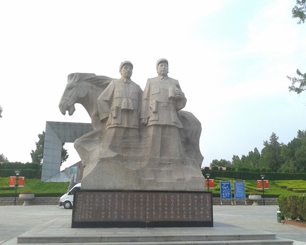 进入孟良崮战役遗址,首先映入眼帘的是陈毅元帅、粟裕将军侍马而立的大型花岗石塑雕,雕像高7.75米,其中底座高2.75米,红色花岗岩上镌刻着陈毅元帅的《孟良崮战役》长诗,两位将帅雕像栩栩如生,再现了当年作为孟良崮战役主要指挥者的光辉形象。 紧接着就是一个纪念碑, 纪念碑碑高30米,由三块状如刺刀的灰色花岗石筑成,象征着野战军、地方军和民兵的武装力量体制。底座为边长20米、高1.6米的正三棱体,组成一个枪托,象征着枪杆子里面出政权。枪托的周围是红色围墙,象征着高山下的花环。纪念碑的上下部构成一个有机的整体,象征着军民团结必胜,人民战争必胜。